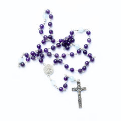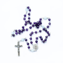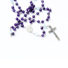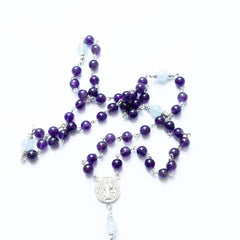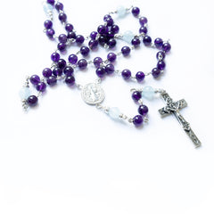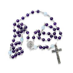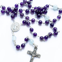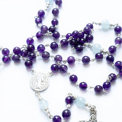 Discover inner peace with the Amethyst and Aquamarine Rosary, featuring the protective symbol of St. Benedict.