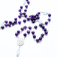 Crafted from authentic 6mm Amethyst and 7mm Amethyst gemstones, accompanied by sterling silver components and St. Benedict medal