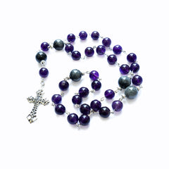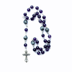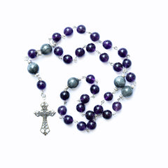 Enchanting Harmony: Elevate your spiritual voyage with our exquisite rosary, meticulously crafted to inspire tranquility and grace. Imbued with the calming essence of Amethyst and the mystical allure of Cats Eye gemstones, each bead is delicately encased in sterling silver, ensuring both durability and elegance