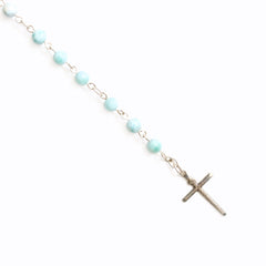Immerse yourself in the tranquil beauty of Larimar gemstones elegantly paired with sterling silver charms of The Dove and Crucifix.