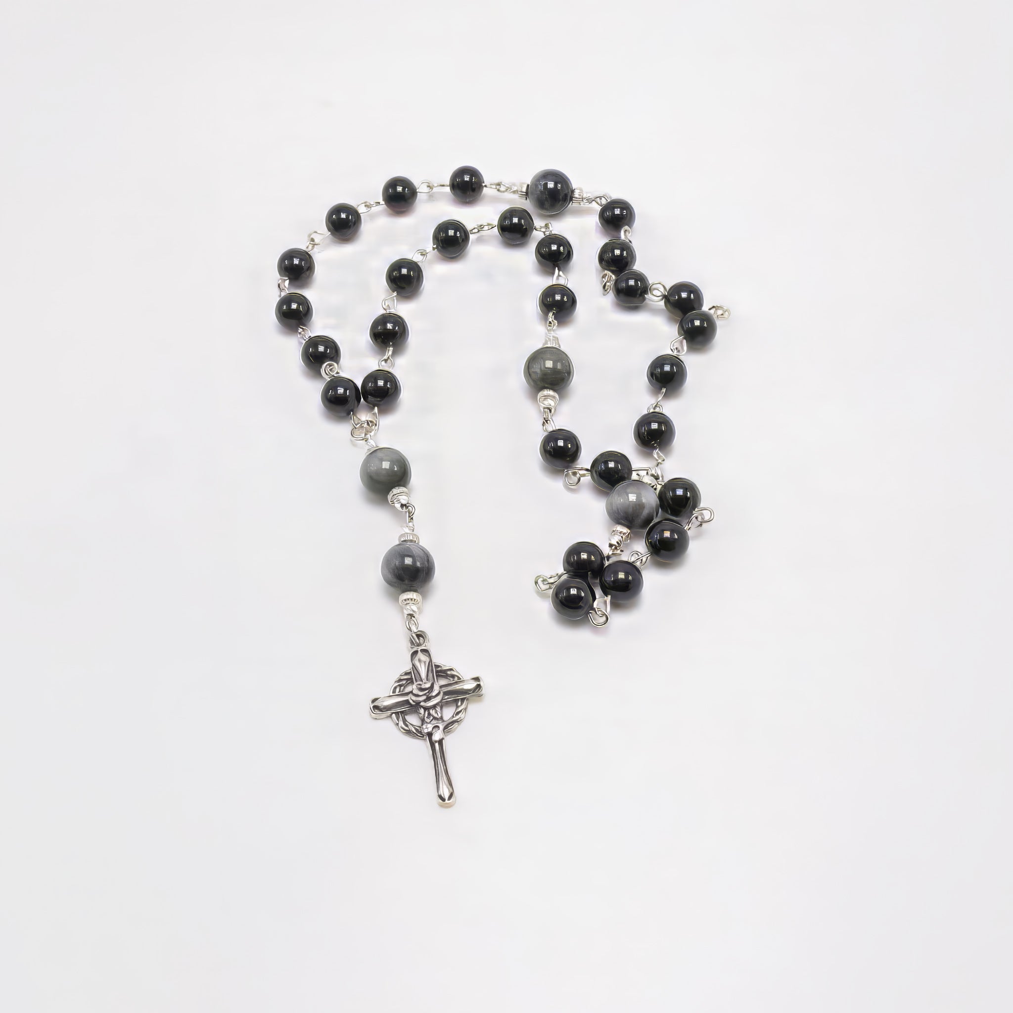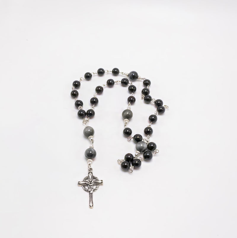 This rosary features a unique cruciform bead design with grounding 8 mm Black Tourmaline gemstones and strong 10 mm Cat’s Eye gemstones that enhance the structure’s balance and strength. Each bead is individually hand-linked and finished with a meticulously designed sterling silver cross, making this piece a timeless symbol of prayer and protection