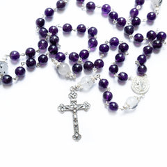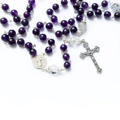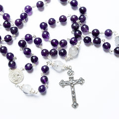 Our Tourmaline Quartz and Amethyst Rosary, enhanced with the protective symbol of St. Benedict